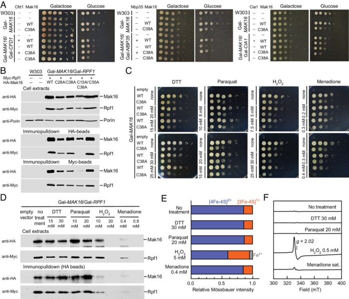 Mak16 contains a pocket designed to hold the [4Fe-4S] cluster in place, stabilized by four cysteine amino acids. The research team created modified versions of Mak16—one with the intact cluster, and one without—to demonstrate the cluster’s importance. Using a technique called immunoprecipitation, they showed that only the intact version could reliably bind to its partner protein, Rpf1.